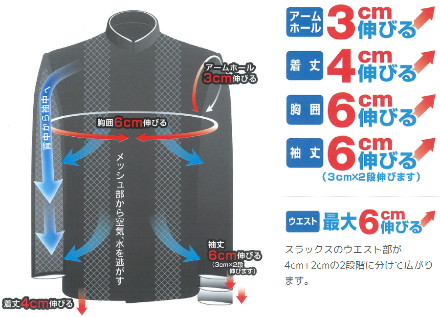 成長に合わせたサイズアップ仕様 アームホール・胸囲・着丈・袖丈・スラックスのウエストなど、各部を成長に合わせて広げることが出来ます。 |