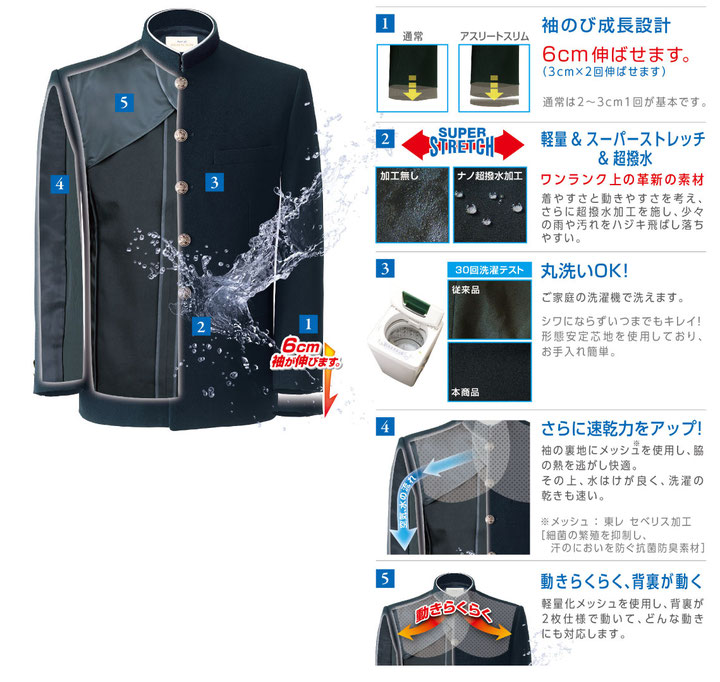 学生服は1サイズ(5cm)で作られています。中学入学時は15~20cmプラスのワンサイズ上の制服を購入することになります。今までの制服だと、大きすぎてかっこ悪いのを我慢して購入・着用していました。