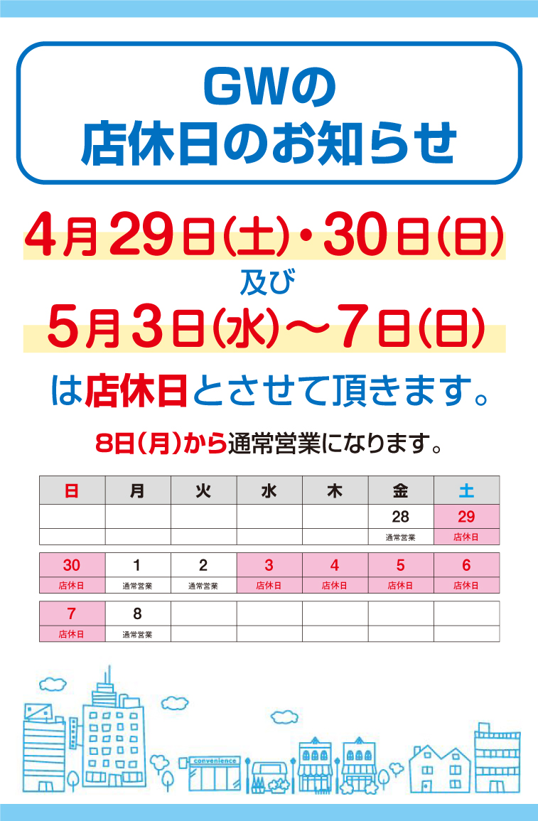 2023.04.28スタッフブログ 2023年 GW休業日のお知らせ Tweet Share Hatena Pocket RSS feedly Pin it 平素は格別のお引き立てを賜り厚く御礼申し上げます。 2023年のゴールデンウィーク休業日は下記の通りとさせていただきます。 おすすめ関連商品 関連記事はありません。 Tweet Share Hatena Pocket RSS feedly Pin it 投稿者: tezuka スタッフブログ 【3月25日16:00~16:30放送】abn長野朝日放送より取材を受けました 関連記事一覧 上履きの選び方 心のバトン♡ 雨の自転車通学にはレインコートが必要 最近の学生服ってすごいんです! 家計にも優しく笑顔をつなぐリユース学生服 子ども達の社会貢献意欲