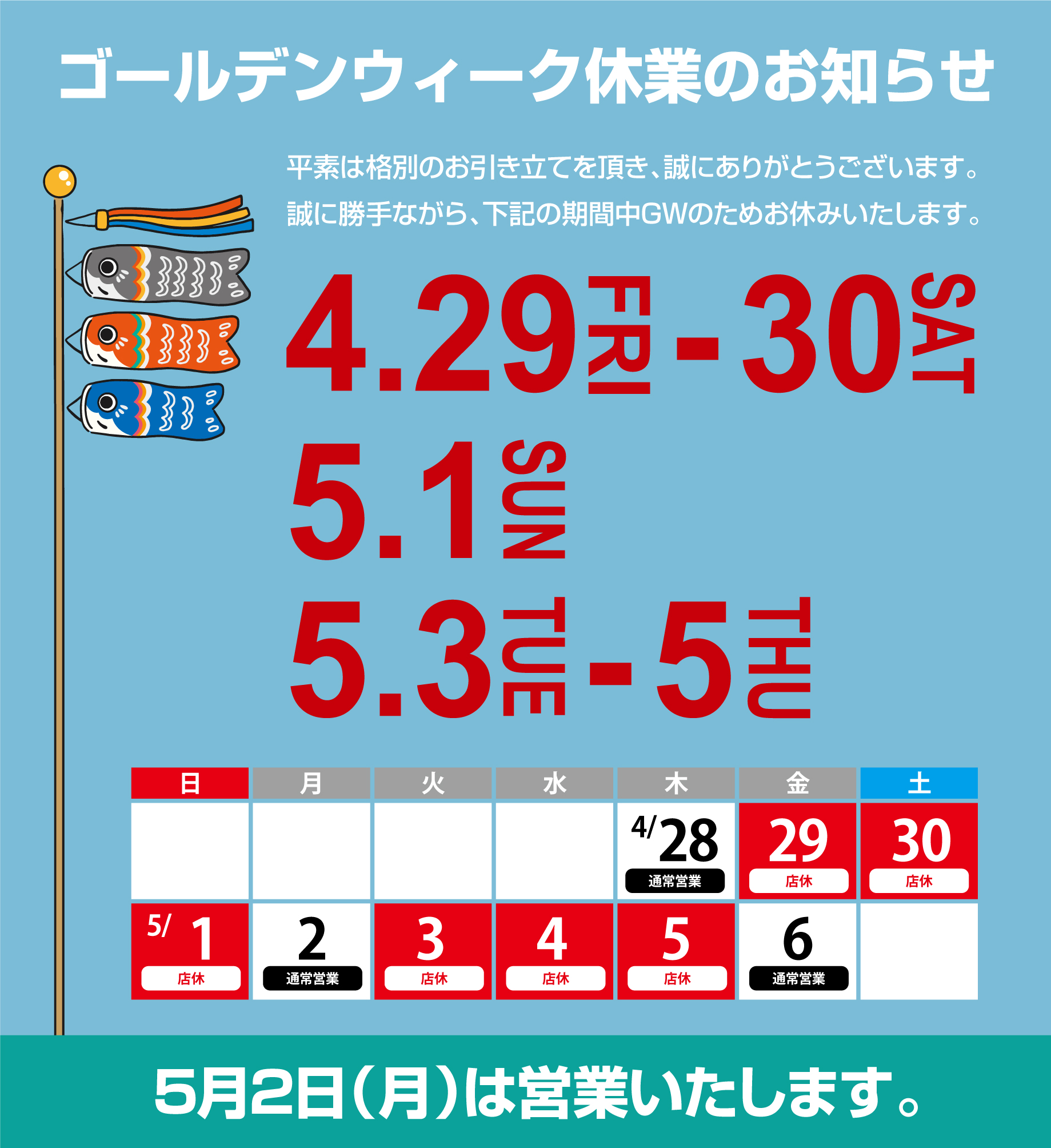 2022.04.28 GW店休日のお知らせ Tweet Share Hatena Pocket RSS feedly Pin it ゴールデンウィークの休業期間についてお知らせ致します。 ご不便をおかけいたしますが、何卒ご了承いただきますようお願い申し上げます。 【ゴールデンウィーク休業期間】 4月29日(金)~30日(土)・5月1日(日)・5月3日(火)~5日(木) 5月2日(月)は営業致します。 Tweet Share Hatena Pocket RSS feedly Pin it 年末年始休業のお知らせ スタッフブログを更新しました 最近のお知らせお知らせ一覧 2025.04.27 2025年 GW休業日のお知らせ 2024.08.07 お盆休みのお知らせ(2024年8月) 2023.12.27 年末年始休業のお知らせ 2023.04.28 2023年 GW休業日のお知らせ 2023.02.24 【2月25日17:00~放送】SBC放送より取材を受けました
