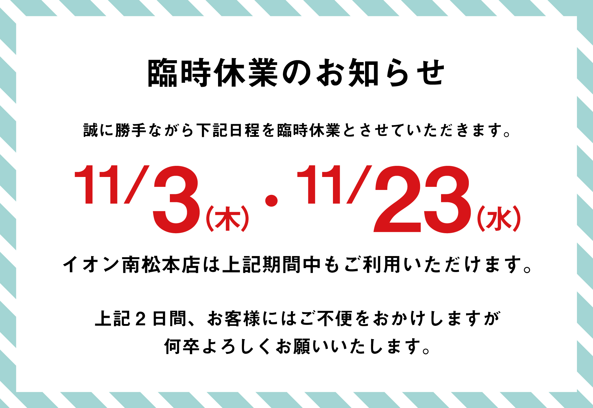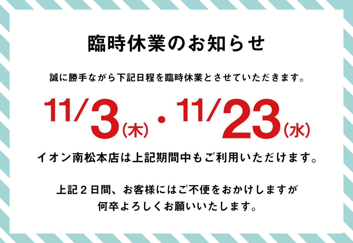 2022.10.29 2022年11月臨時休業のお知らせ Tweet Share Hatena Pocket RSS feedly Pin it 誠に勝手ながら下記日程を臨時休業及び発送業務をお休みさせて頂きます。。 お客様にはご不便をおかけしますが、何卒よろしくお願いいたします。 お直し期間や内容など各種お問い合わせはこちらから Tweet Share Hatena Pocket RSS feedly Pin it 中学生男子の靴下問題、どうしたら良い?【スタッフブログを更新しました】 スタッフブログを更新しました 最近のお知らせお知らせ一覧 2025.04.27 2025年 GW休業日のお知らせ 2024.08.07 お盆休みのお知らせ(2024年8月) 2023.12.27 年末年始休業のお知らせ 2023.04.28 2023年 GW休業日のお知らせ 2023.02.24 【2月25日17:00~放送】SBC放送より取材を受けました