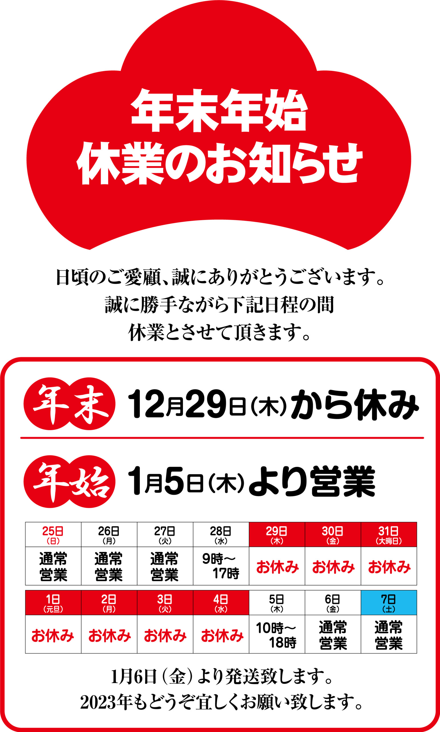 日頃のご愛顧、誠にありがとうございます。誠に勝手ながら下記日程の間、年末年始休業とさせて頂きます。