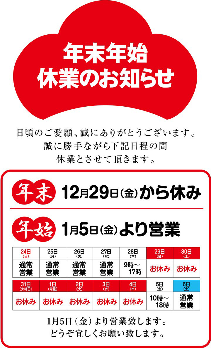 誠に勝手ながら下記日程の間、年末年始休業とさせて頂きます。